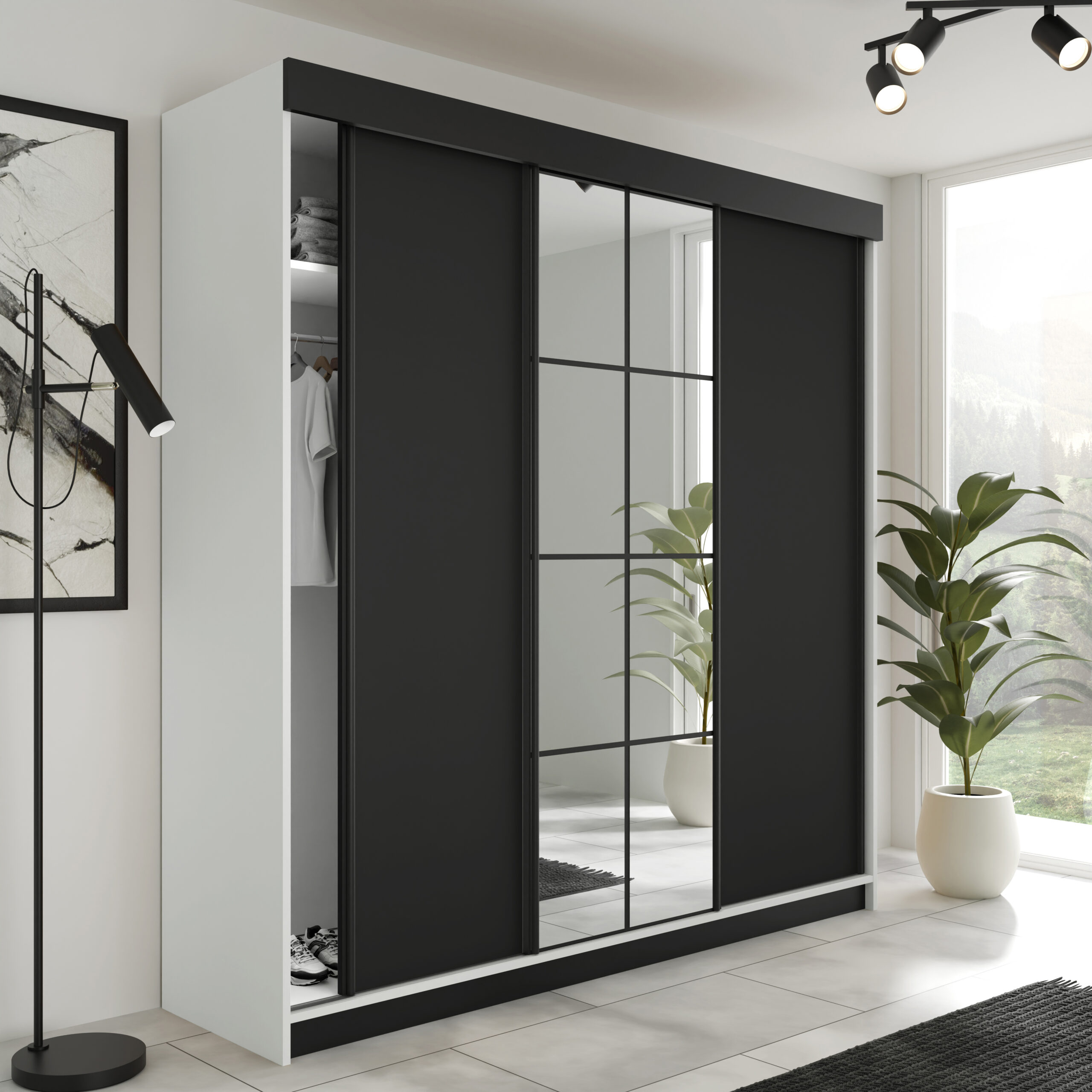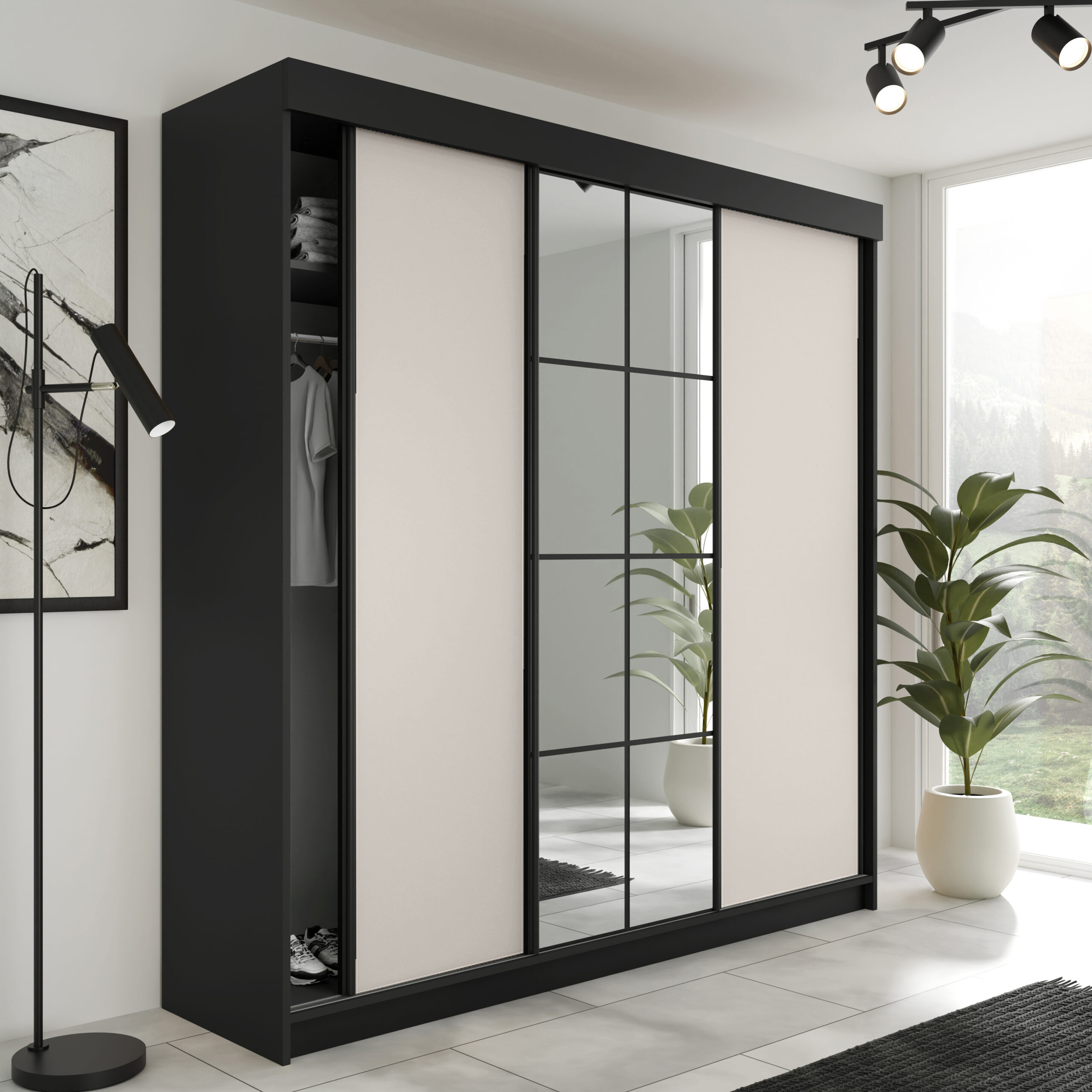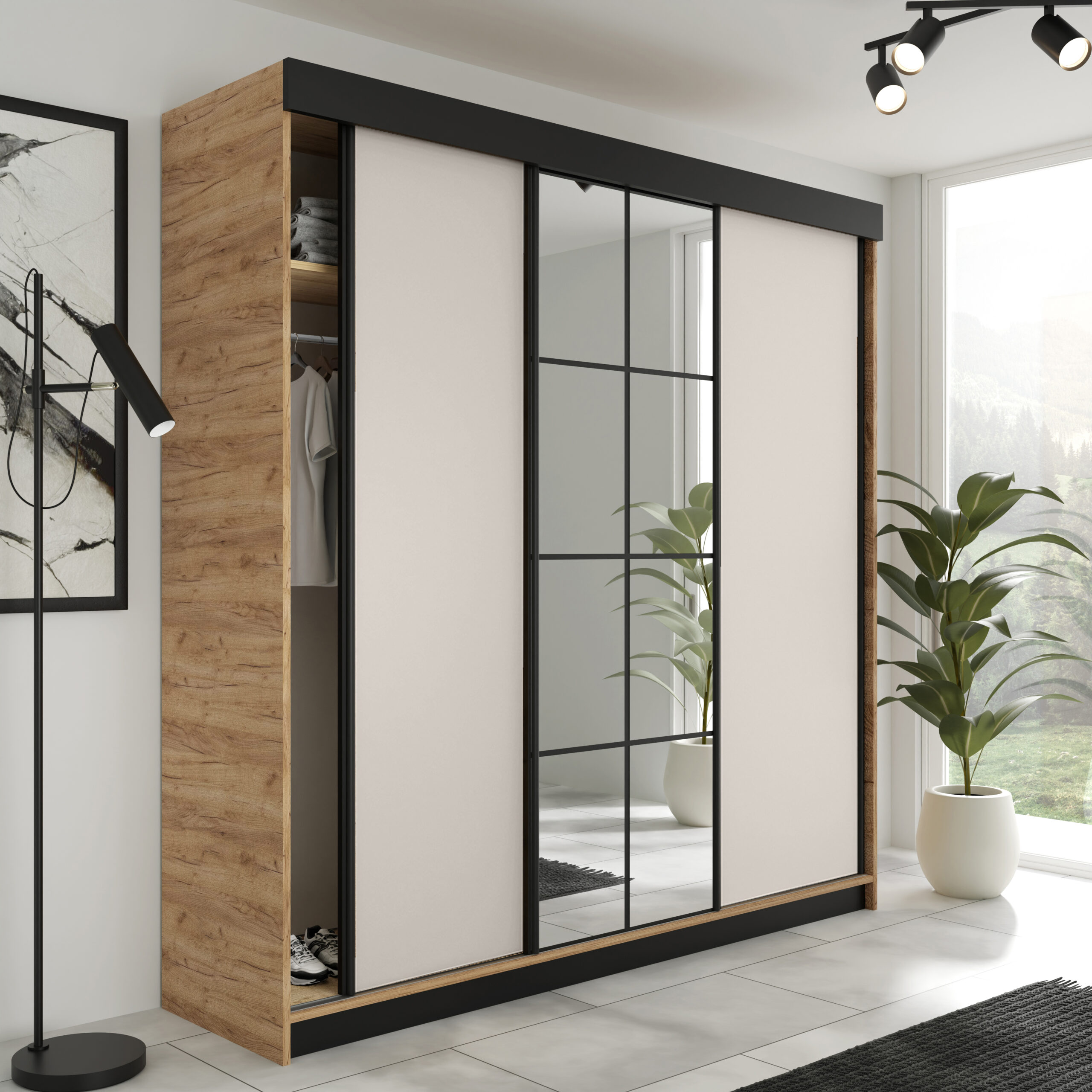 Der Kleiderschrank LAMER ist eine moderne und geräumige Lösung für Schlafzimmer, Ankleidezimmer oder Flur. Dank der praktischen Schiebetüren eignet sich der Schrank ideal auch für kleinere Räume, da kein zusätzlicher Platz zum Öffnen der Türen benötigt wird.