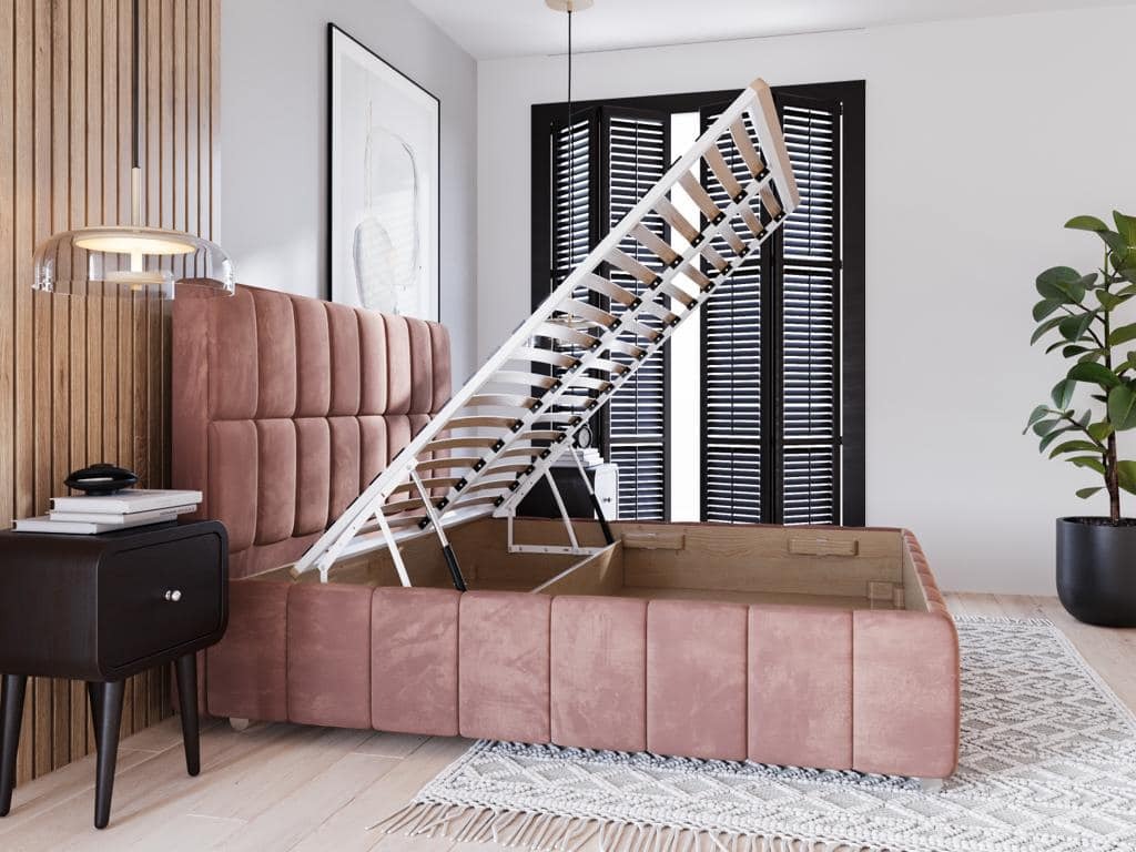 FurMeb24 ALMA – Polsterbett mit Bettkasten und Holzrahmen – Doppelbett mit höher Kopstütze – Ohne Matraze