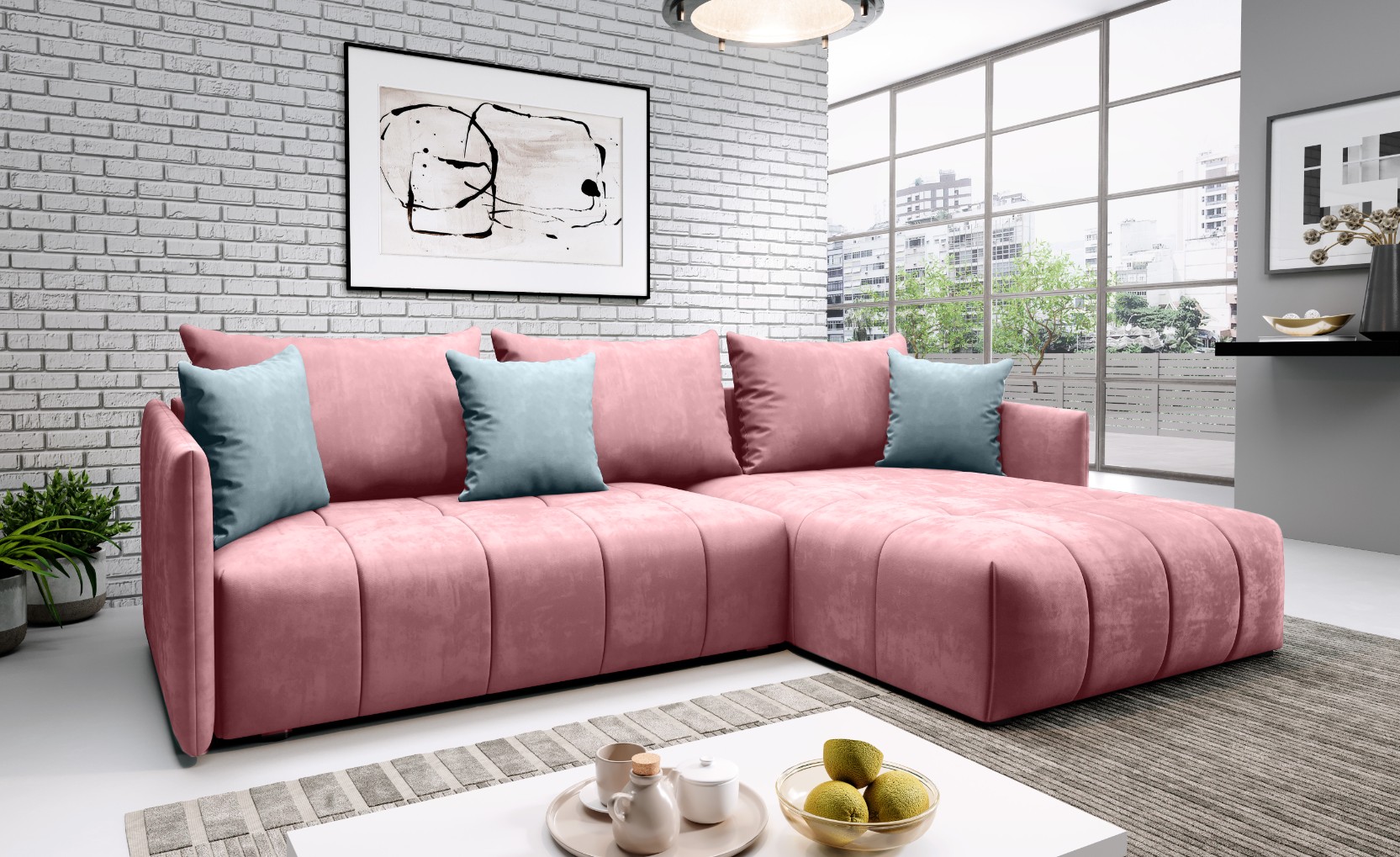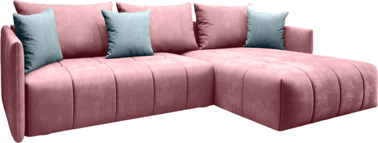 - Die Ecke ist aus Stoff: Amore 19 (Pulverrosa), dekorative Kissen aus Stoff Amore 20 (Blau)