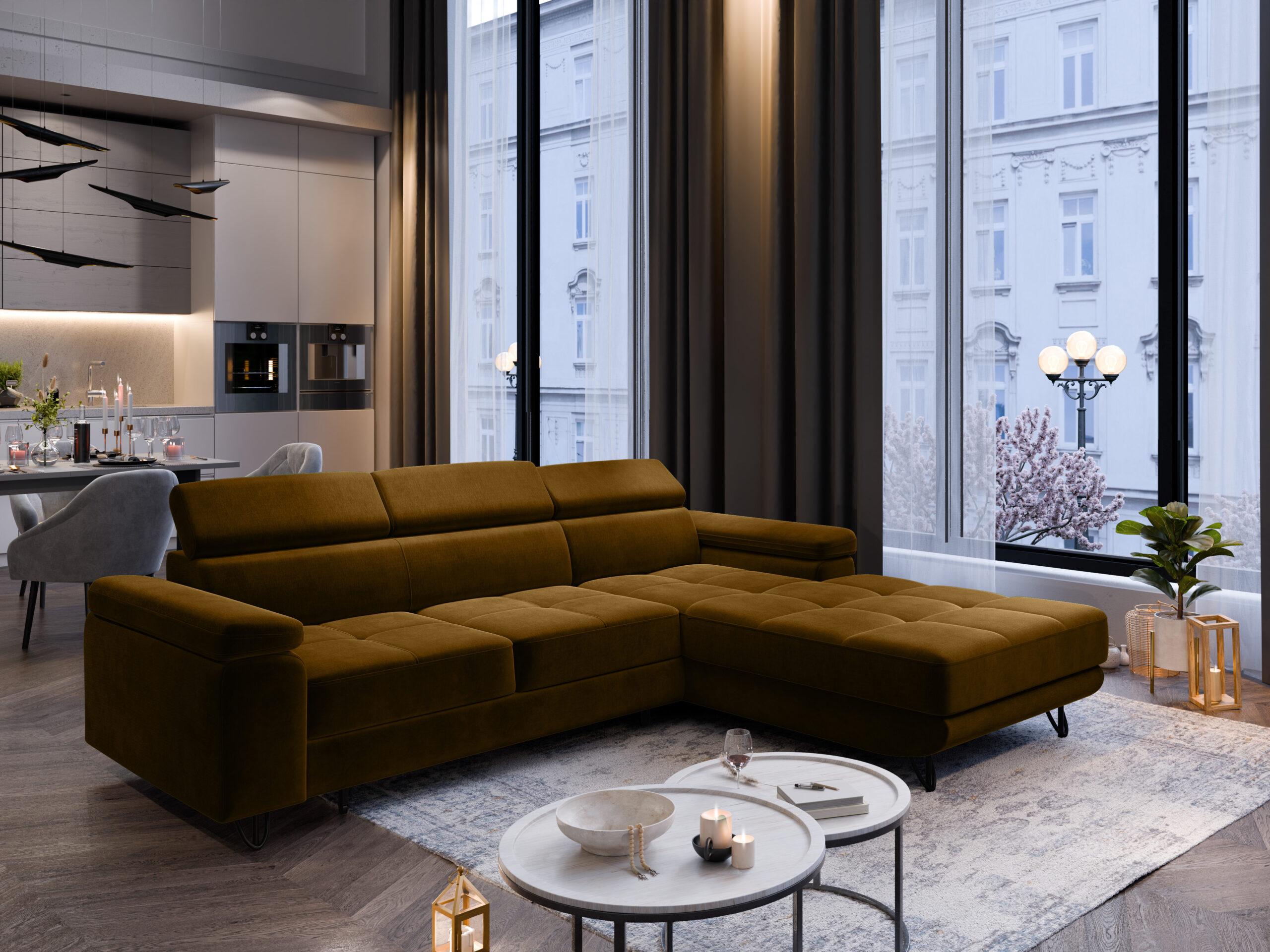 Das Ecksofa OLIVIO verbindet stilvolles Design mit hoher Funktionalität und einem hervorragenden Sitzkomfort. Es eignet sich ideal für größere Wohnzimmer, passt aber ebenso gut in kompaktere Räume. Dank durchdachter Konstruktion und hochwertiger Materialien wird OLIVIO schnell zum Mittelpunkt jedes Wohnbereichs.