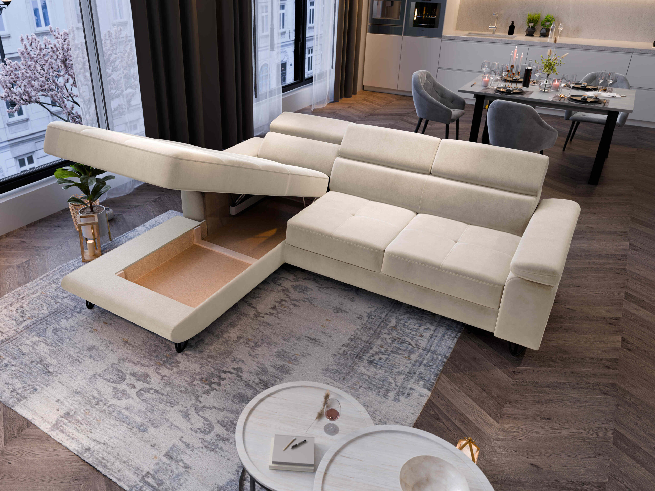Modernes und funktionales Ecksofa mit Schlaffunktion und Bettkasten. Verstellbare Kopfstützen (3 Stück), bequeme Sitzfläche mit T30-Schaum und Wellenunterfederung.