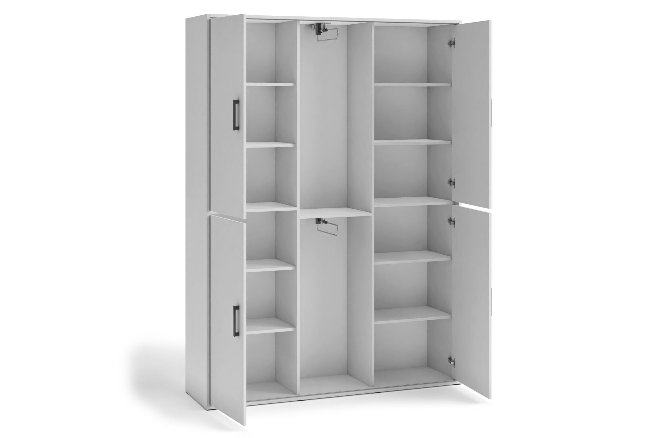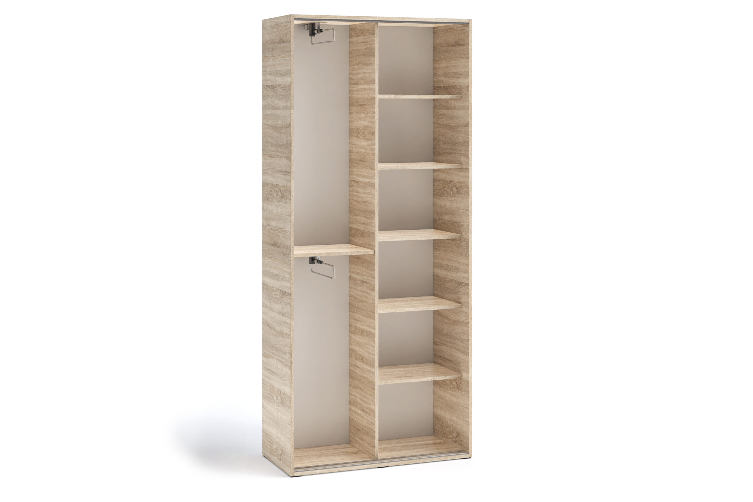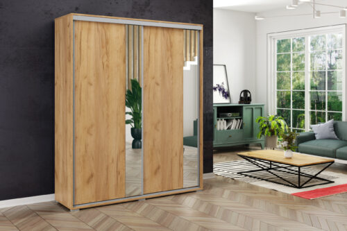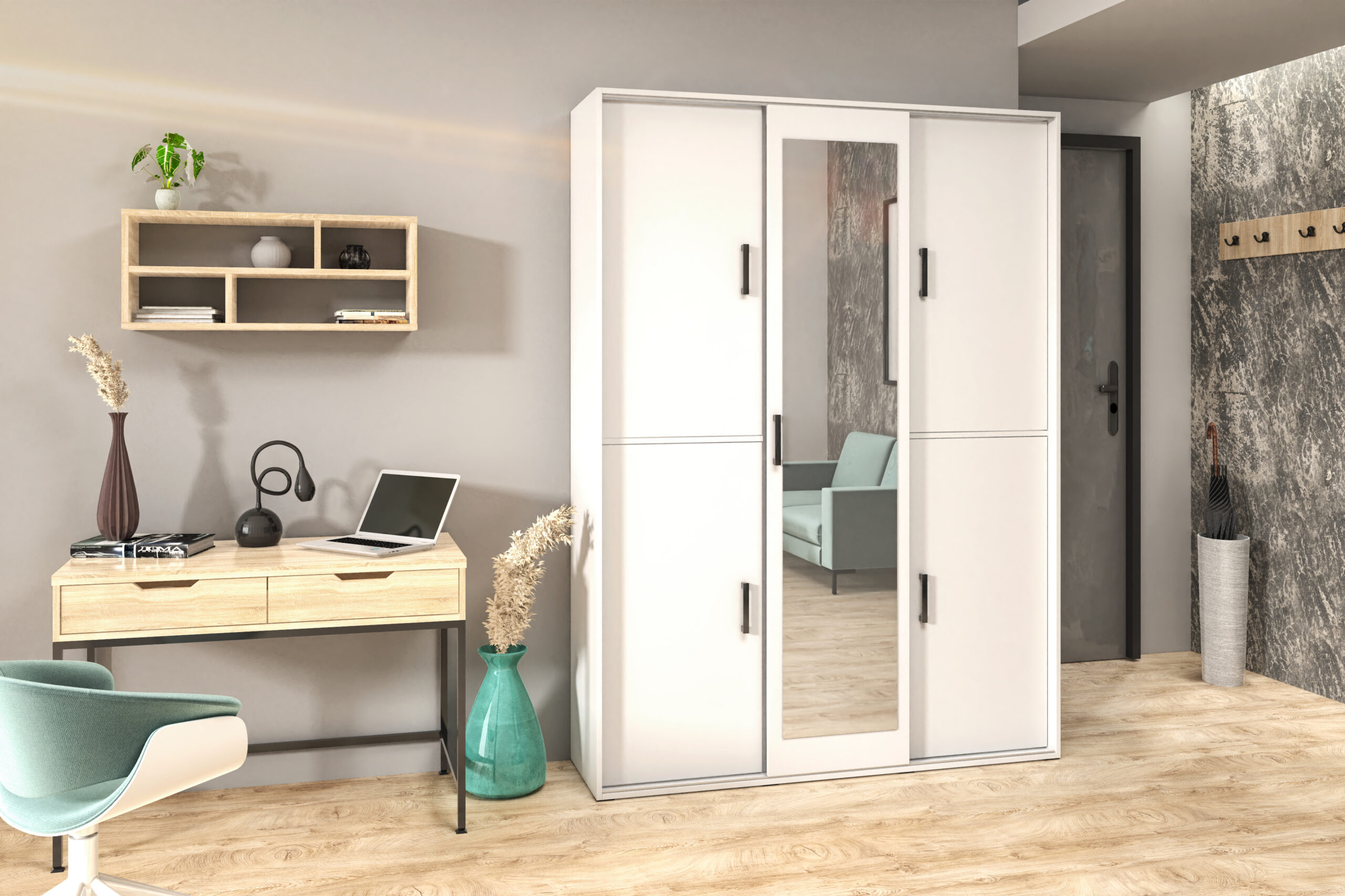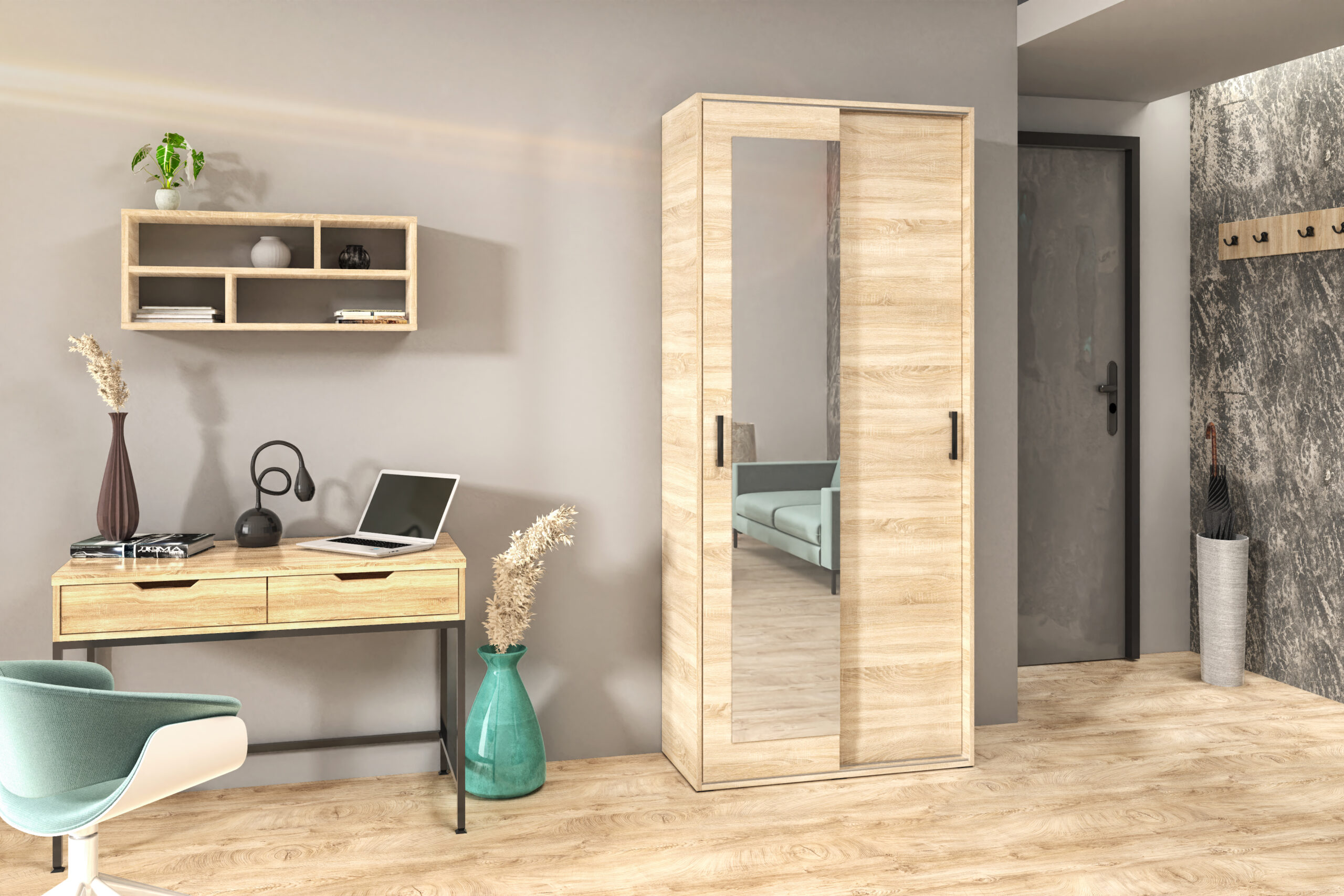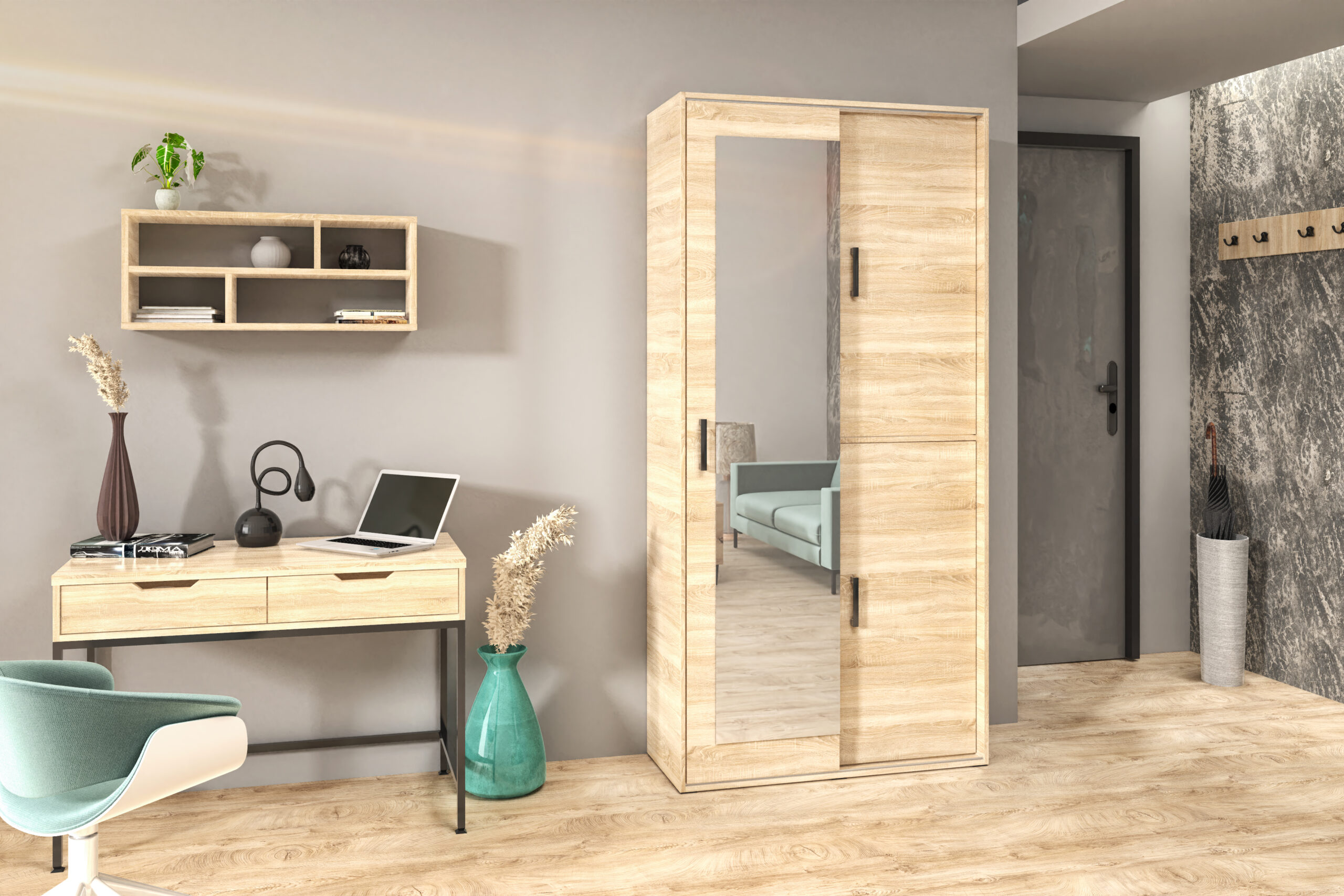 Ein integrierter Spiegel vergrößert optisch den Raum, während Kleiderstange und verstellbare Einlegeböden flexible Aufbewahrung ermöglichen. Griffe aus Kunststoff sorgen für komfortable Handhabung.